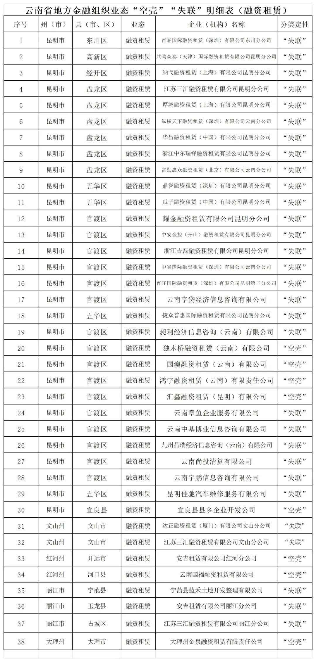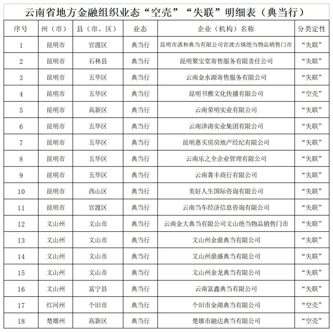 名单包括70家机构,其中:名称或经营范围包含“小额贷款公司”的机构12家、名称或经营范围包含“融资担保公司”的机构2家、名称或经营范围包含“典当行”的机构18家、名称或经营范围包含融资租赁公司的机构38家。公示期为2025年11月7日至2025年12月6日。对本公示内容如有异议,请于公示期内联系云南省地方金融管理局,或以书面形式向云南省地方金融管理局反映。